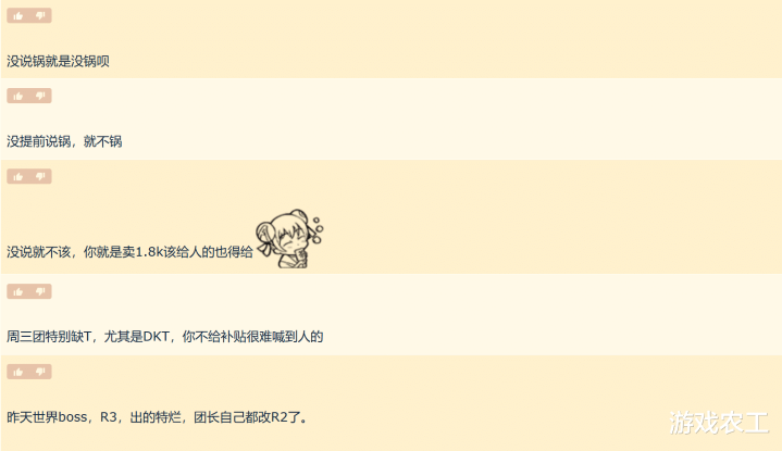 此时DPS跟DKT开始对喷,DKT表示,团长在开打的时候没有提及大锅饭,并且已经说好了这个团是硬性补贴,所以无论打多少金币都要进行补贴,不然就是毛补贴。而DPS则表示,根据游戏惯例,拍卖金额低于平均值,就默认大锅饭,不然就是给T打黑工。但是说实话,这个所谓的惯例农工确实没有遇见过,有懂的小伙伴说说吗?为什么会有这个惯例,那是不是只有一半的T和奶可以拿到补贴呢?