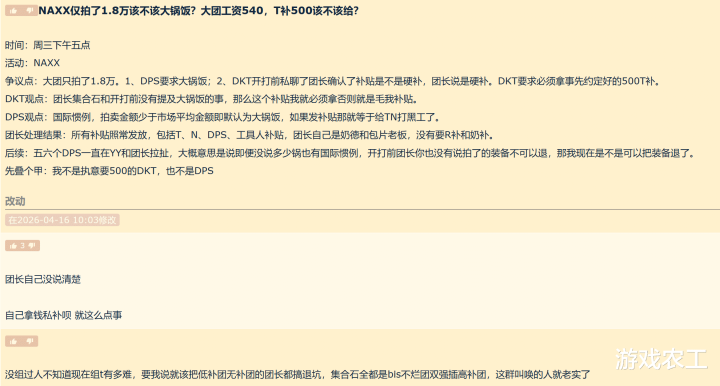这个时候也有玩家开始抬杠了,说一开始团长没有说竞拍的装备不能退,是不是也可以退之类的话,加入到了战斗中。而这次本质问题在于NAXX团本的整体收益比较低,所以导致了大家开始计较补贴;其次就是很多情况下如果不补贴DKT,其实根本组不起来。并且最终的结果是团长自己是奶德和包片老板,没有要坦克补贴和治疗补贴,所以本质上团长就已经放弃了自己的补贴。